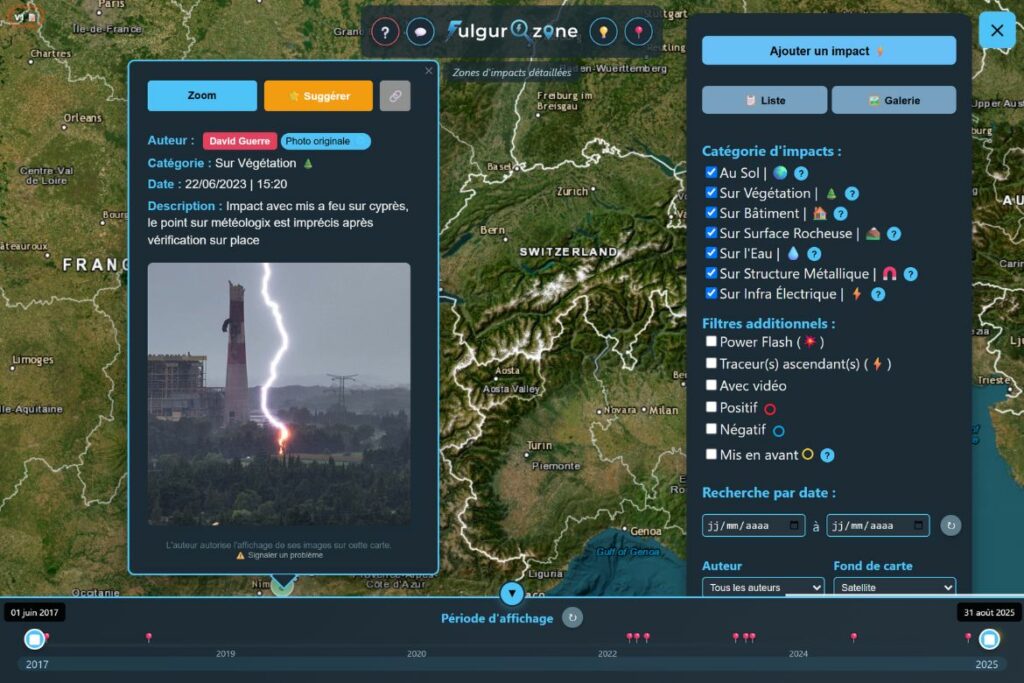 Concrètement, Fulgur’Zone est une carte interactive libre et gratuite pensée pour l’observation et l’analyse. L’interface s’accompagne d’une timeline qui permet d’explorer les événements dans le temps. Les impacts sont classés selon le matériau touché (du sol aux infrastructures électriques) afin de mettre en avant les différences de comportement de la foudre selon les supports. Des badges mettent en évidence des phénomènes remarquables, comme les “Power Flash” liés aux surtensions sur les réseaux, ou les traceurs ascendants qui remontent vers le nuage, facilitant l’identification rapide des cas rares.